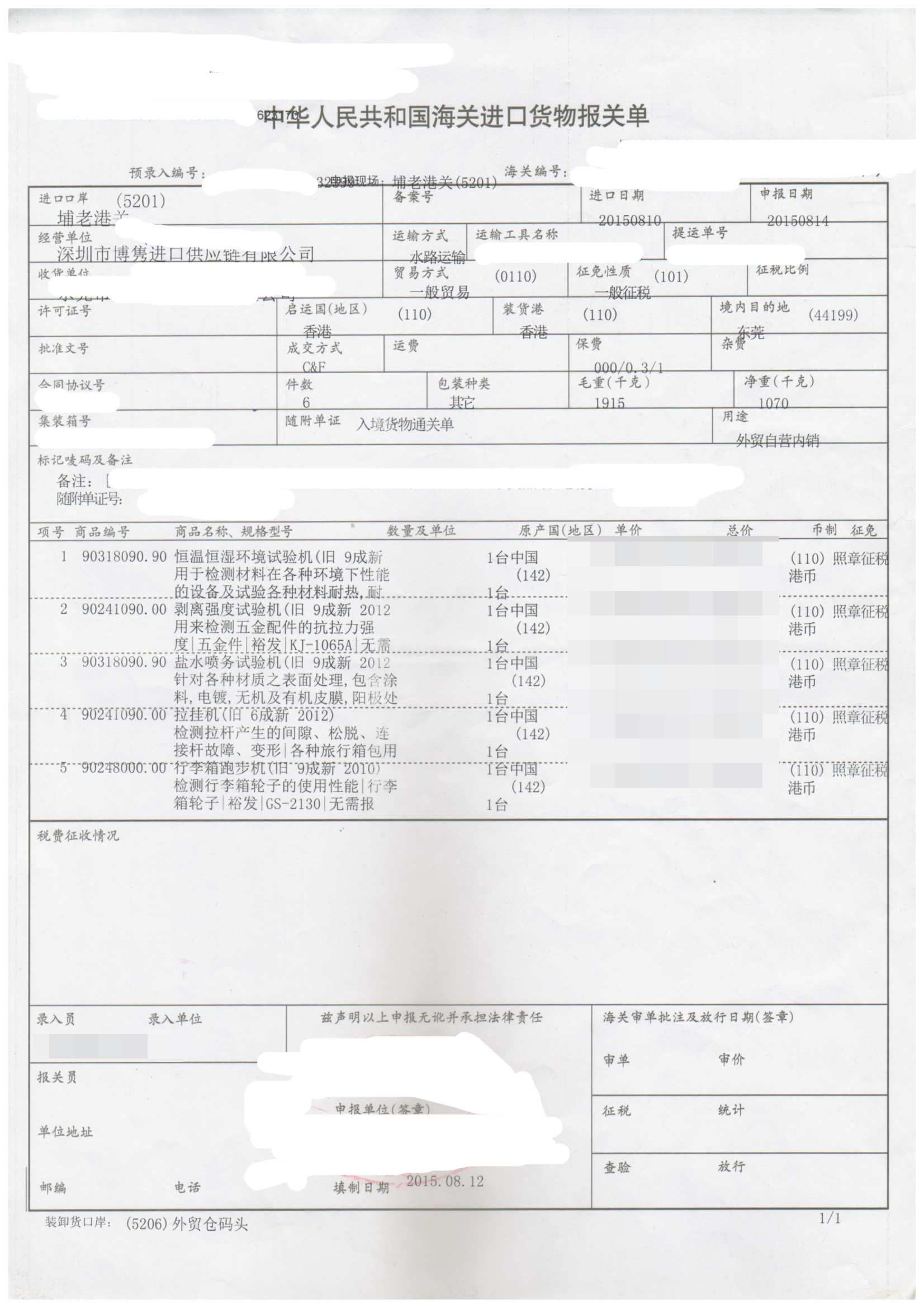 一、舊試驗機進口報關手續資料