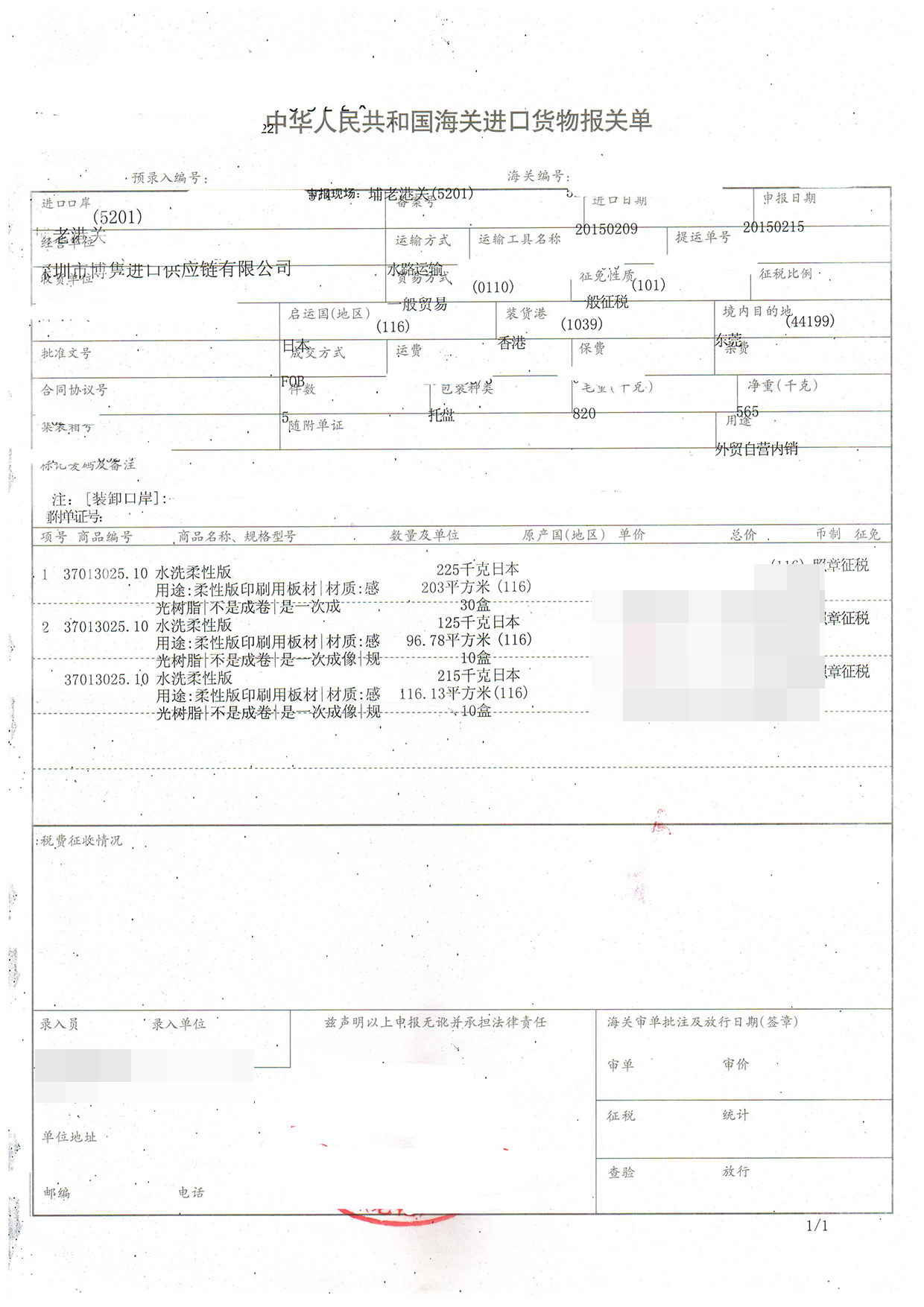 三、水洗柔性版進(jìn)口報關(guān)案例展示