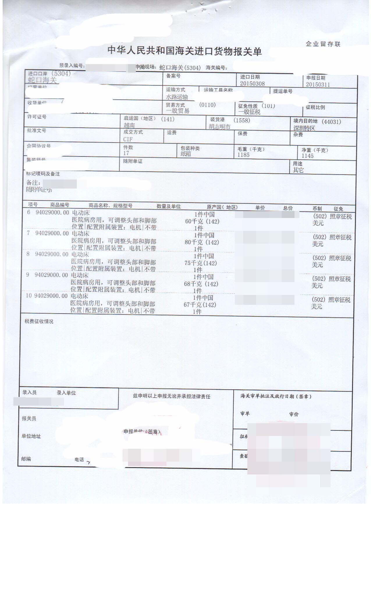 三、電動床進口報關案例展示