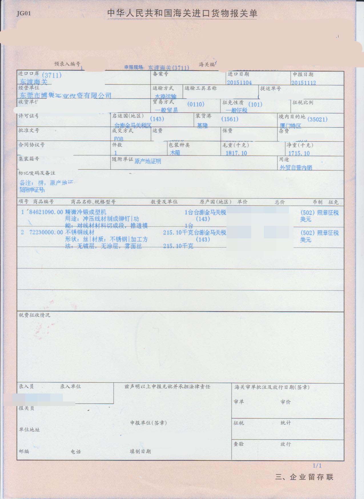 三、精微冷鍛成型機(jī)進(jìn)口報(bào)關(guān)案例展示