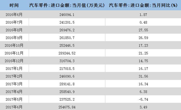 以下為2016年6月—2017年6月我國汽車零件進口金額統計: