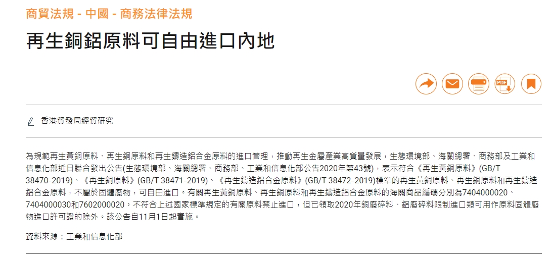 為規范再生黃銅原料、再生銅原料和再生鑄造鋁合金原料的進口管理,推動再生金屬產業高質量發展,生態環境部、海關總署、商務部及工業和信息化部近日聯合發出公告(生態環境部、海關總署、商務部、工業和信息化部公告2020年第43號),表示符合《再生黃銅原料》(GB/T 38470?2019)、《再生銅原料》(GB/T 38471?2019)、《再生鑄造鋁合金原料》(GB/T 38472?2019)標準的再生黃銅原料、再生銅原料和再生鑄造鋁合金原料,不屬于固體廢物,可自由進口。有關再生黃銅原料、再生銅原料和再生鑄造鋁合金原料的海關商品編碼分別為7404000020、7404000030和7602000020。不符合上述國家標準規定的有關原料禁止進口,但已領取2020年銅廢碎料、鋁廢碎料限制進口類可用作原料固體廢物進口許可證的除外。該公告自11月1日起實施。